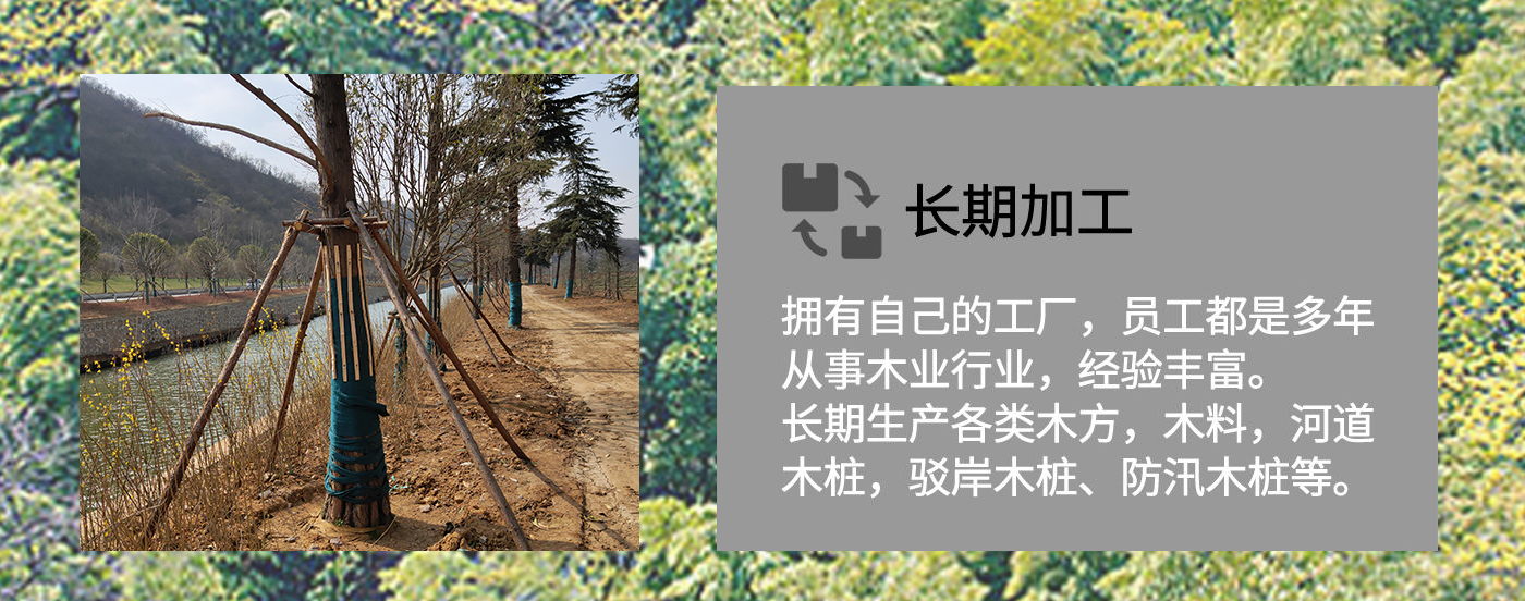 南京市云森木業(yè)有限公司位于南京市高淳區(qū)。是一家生產(chǎn)加工,線上銷售為一體的現(xiàn)代化企業(yè)。擁有完善、科學(xué)的質(zhì)量管理體系及工作團(tuán)隊(duì)。 公司主營(yíng)松木樁,杉木樁,打樁木,河道木樁,駁岸木樁,防汛木樁,景觀木樁、園林綠化支撐桿等,也可支持方料,木板等木材定制加工產(chǎn)品,所選原材料均為黃山中心林區(qū),樹齡均在三十年左右。質(zhì)地緊密,樹形優(yōu)美。 本公司貨源充足,供貨能力強(qiáng),地處高淳,交通方便利,江浙滬皖送貨上門,當(dāng)天可達(dá)。本著“誠(chéng)信為本,客戶至上”的經(jīng)營(yíng)宗旨,真誠(chéng)希望與您合作。 歡迎各位客戶前來(lái)咨詢,定以優(yōu)良品質(zhì)和價(jià)格回饋廣大客戶。