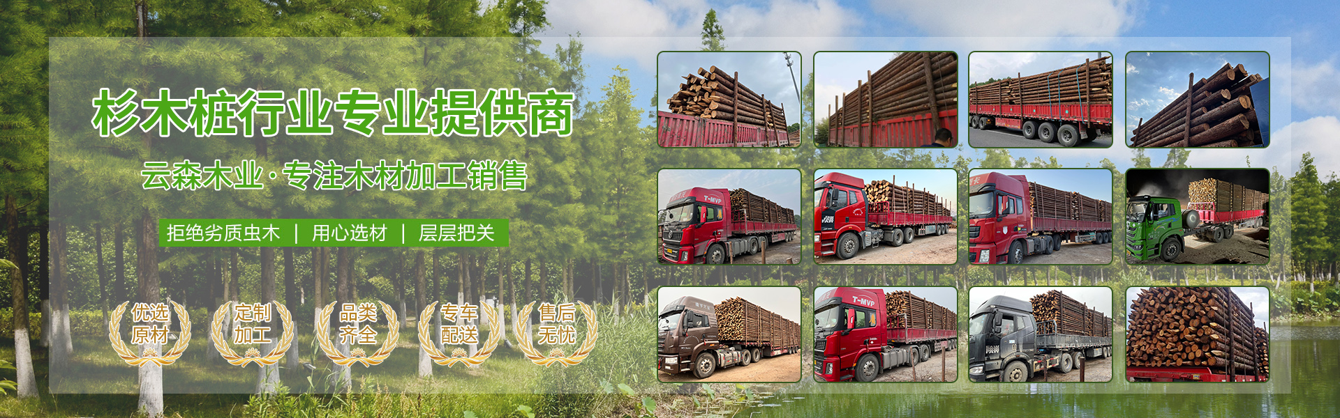 南京市云森木業(yè)有限公司位于南京市高淳區(qū)。是一家生產(chǎn)加工,線上銷售為一體的現(xiàn)代化企業(yè)。擁有完善、科學(xué)的質(zhì)量管理體系及工作團(tuán)隊(duì)。 公司主營(yíng)松木樁,杉木樁,打樁木,河道木樁,駁岸木樁,防汛木樁,景觀木樁、園林綠化支撐桿等,也可支持方料,木板等木材定制加工產(chǎn)品,所選原材料均為黃山中心林區(qū),樹齡均在三十年左右。質(zhì)地緊密,樹形優(yōu)美。 本公司貨源充足,供貨能力強(qiáng),地處高淳,交通方便利,江浙滬皖送貨上門,當(dāng)天可達(dá)。本著“誠(chéng)信為本,客戶至上”的經(jīng)營(yíng)宗旨,真誠(chéng)希望與您合作。 歡迎各位客戶前來(lái)咨詢,定以優(yōu)良品質(zhì)和價(jià)格回饋廣大客戶。